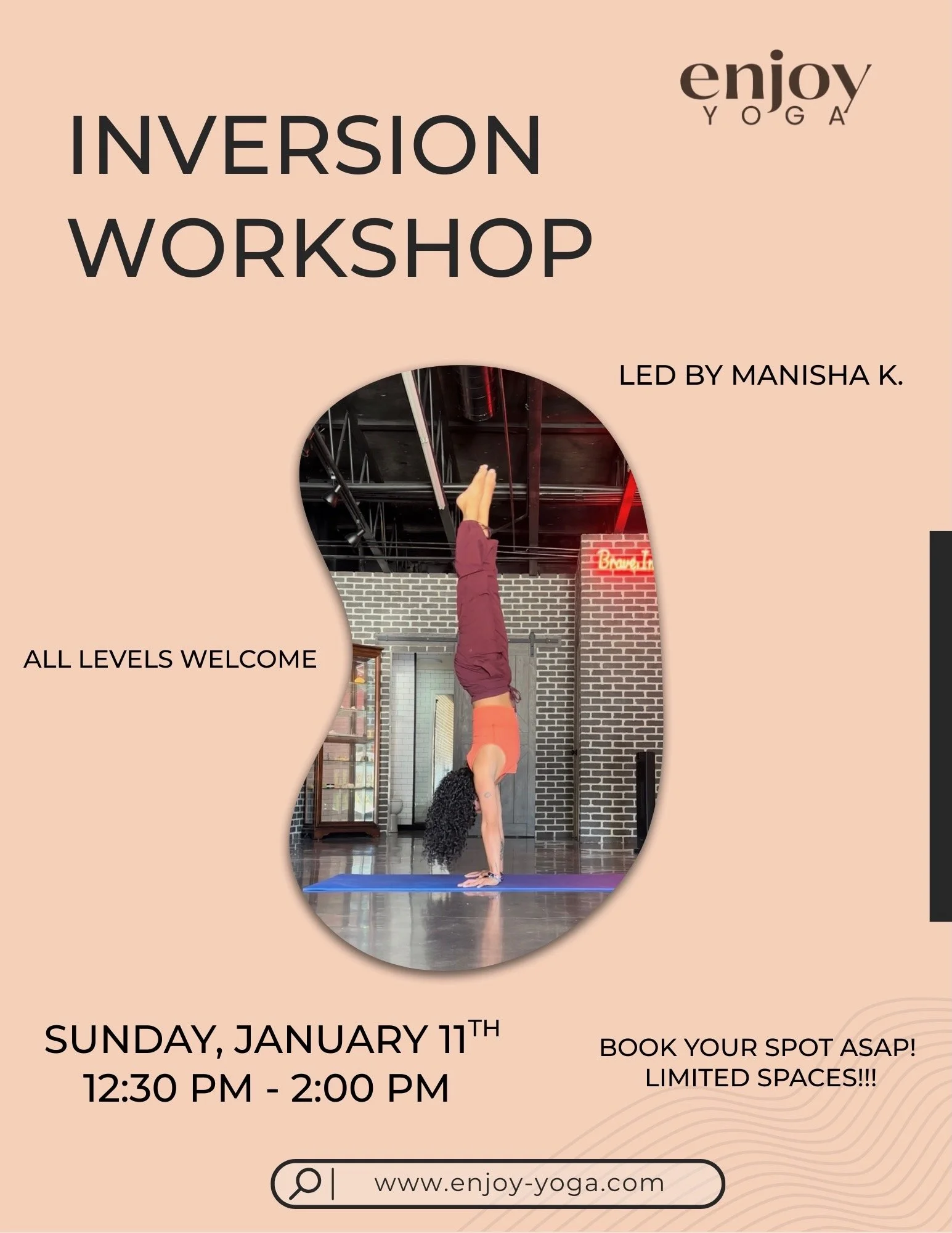 Join Manisha in a playful and strength building workshop to help you find your balance in inversions. Together, we’ll break down the foundations of safe inversions through mindful alignment, breathwork, and accessible progressions. Come ready to move, explore, and surprise yourself!